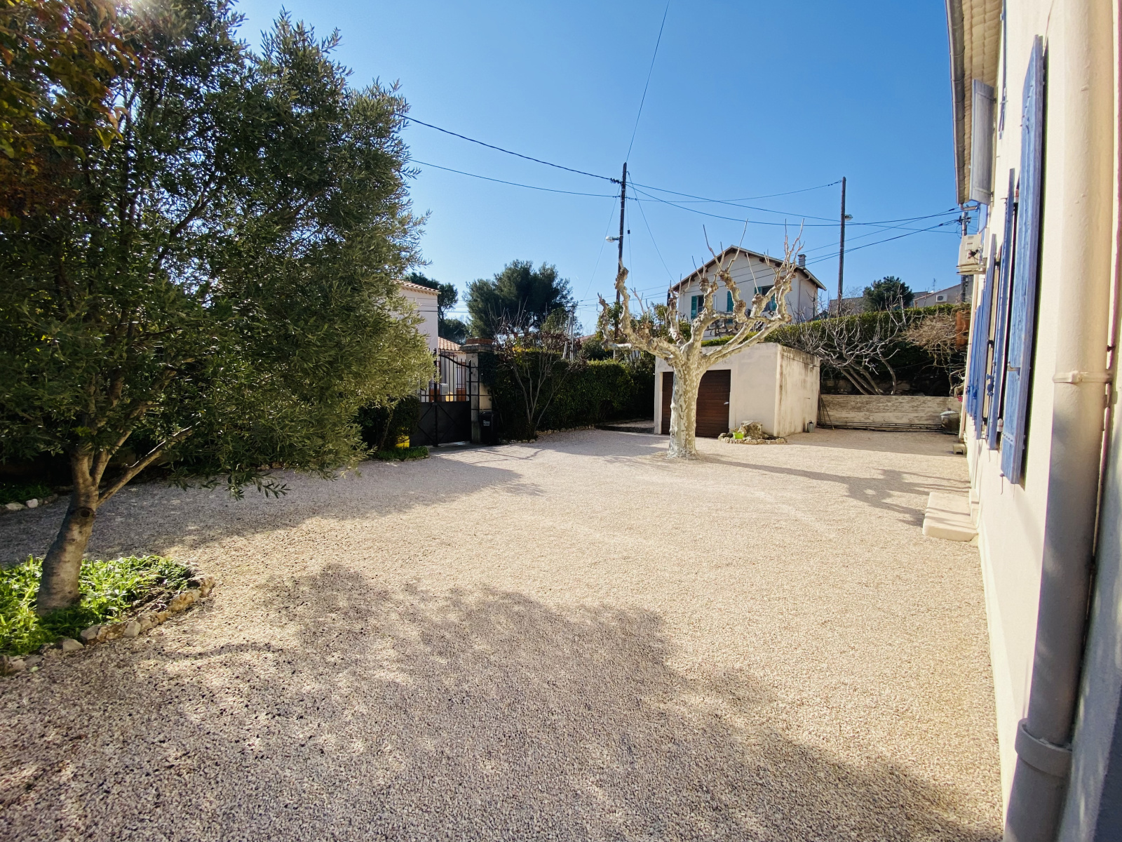 Un jardin arboré, plat et ensoleillé dans lequel il est possible de stationner plusieurs véhicules et un garage clos.